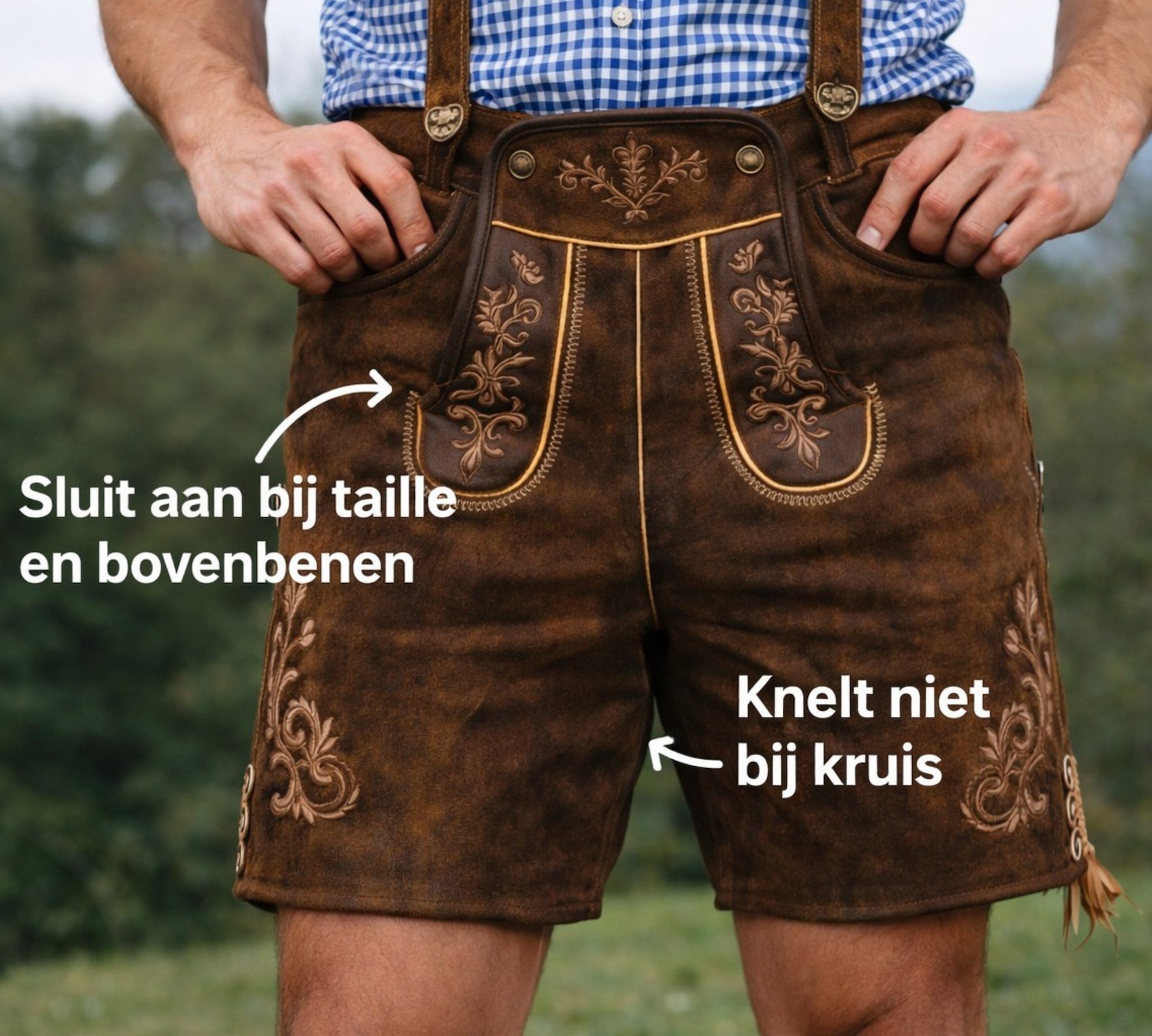 Een goed zittende lederhose voelt stevig en aangesloten, zonder dat het oncomfortabel wordt. Je moet kunnen lopen, zitten en bewegen zonder dat de broek knelt of trekt.